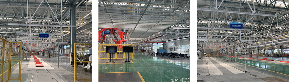 具有承載式、非承載式,3-5米的各類智能駕駛車輛的柔性生產能力,主線體包括內飾線、底盤線、車架線、合裝線、分裝線。采用PLC全自動控制系統、AGV自行轉運小車、KBK自動輸送等。