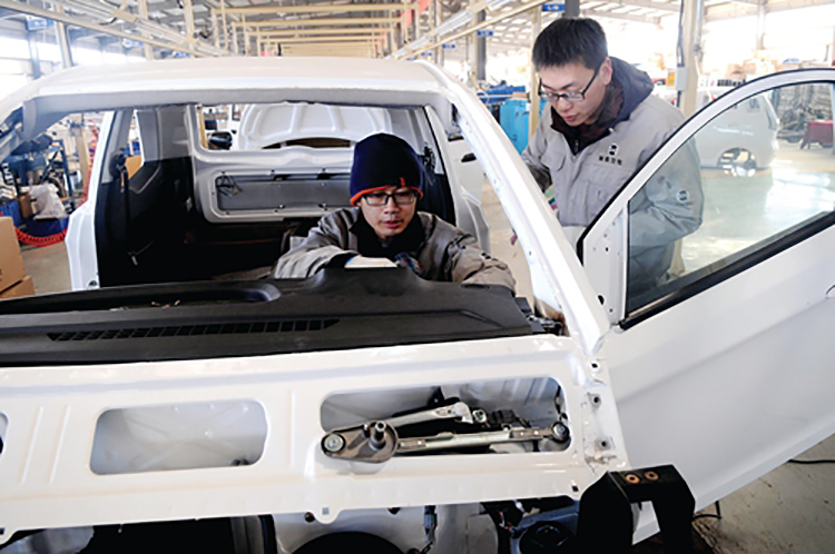 山東省淄博舜泰電動汽車公司春節(jié)后首批電動車啟運(yùn)河南。擁有7款自主知識產(chǎn)權(quán)的淄博舜泰電動汽車公司自2015年6月產(chǎn)品投放市場以來,以其產(chǎn)品造型新、市場定位準(zhǔn)而頗受歡迎,并承接了年銷1000至1500輛的美國訂單。圖為儀表安裝工正在安裝儀表。